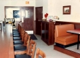 Entrance to the room through a vestibule and then immediately to the right a host stand and then booth seating.