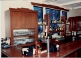 The velvet curtain, background right, was a small stage for entertaining. The bar has two cabinets for televisions with flipper doors. The nose of the bar has a t-molding metal band.