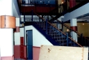 Looking towards the rear of the building, steel beams held with rivets give an idea of its turn of the century age. The vertical shaft just behind the stairs, held the elevator that worked by pulling a looped rope either up or down to lift or decend and it was up to you to plumb the lift with the floor.