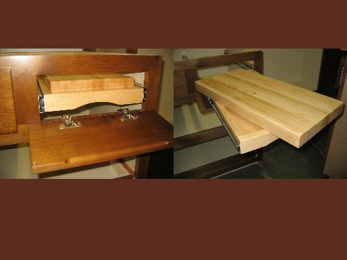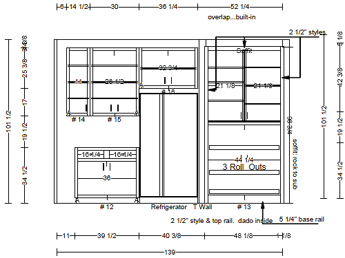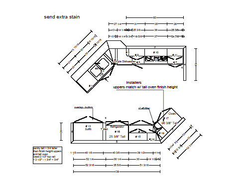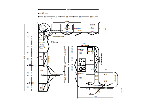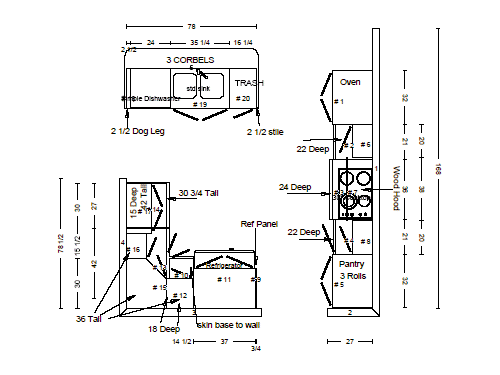 This is an alder kitchen toned in rosewood stain. Check out the custom cutting board. Because of the location of the refrigerator the base next to the refrigerator was pulled off the wall and the upper and one side of the upper corner are 18" deep. A better look. floor plan