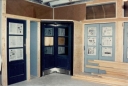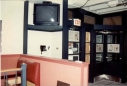 Almost complete, still missing the host station located near the telephone, a couple of windows in the side lite next to the revolving door and the last coat of paint. Along the wall, towards the lower left-hand of the photo is the start of booths for bar patrons while they wait for their table.