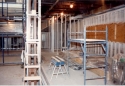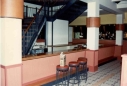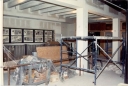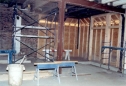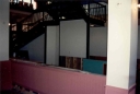 This is where the booths will be located a couple of months before they were installed. The unpainted boarded area above and to the right is an opening for a bank of window. All the riveted beams will be fire rocked and all wood sprayed with fire retardant.