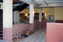 On a platform of tongue and groove oak, powder-coated, perimeter railing with brackets to support a drink rail, the booths await their first customers to break-in the cranberry red Naugahyde. The floor is tiled in octagonal tile in shades of white, grey, and poweder yellow.